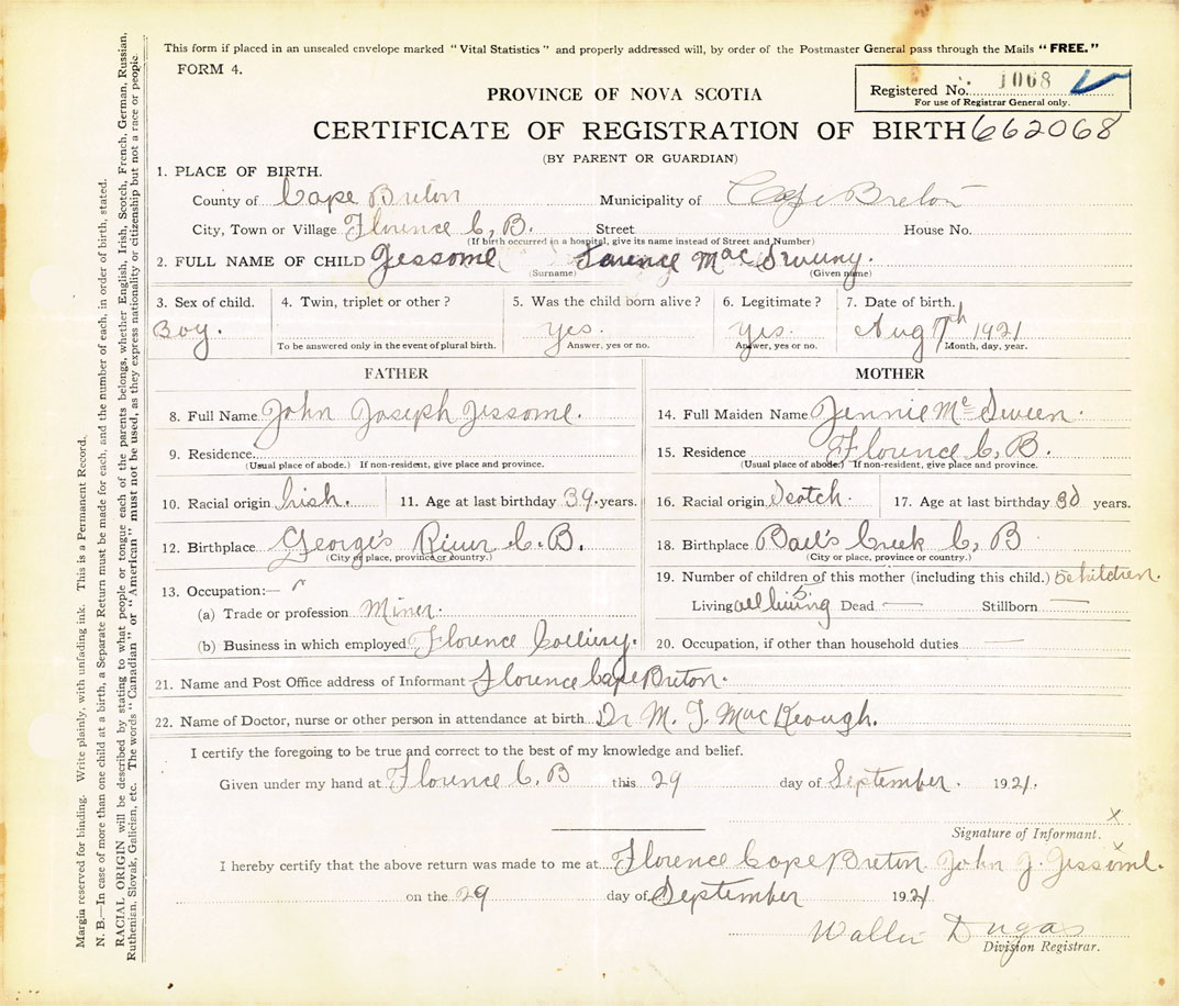 21. Name and Post Office address of Informant Florence, Cape Breton