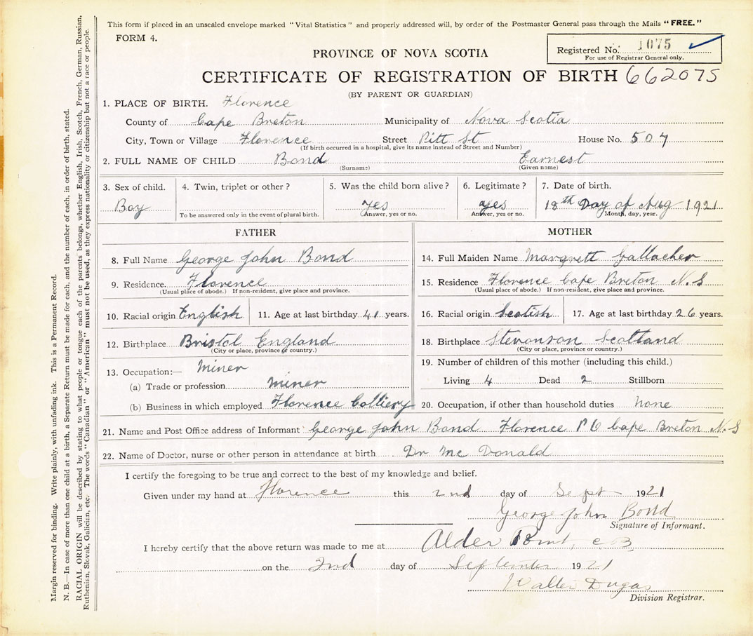 21. Name and Post Office address of Informant George John Bond Florence Post Office, Cape Breton