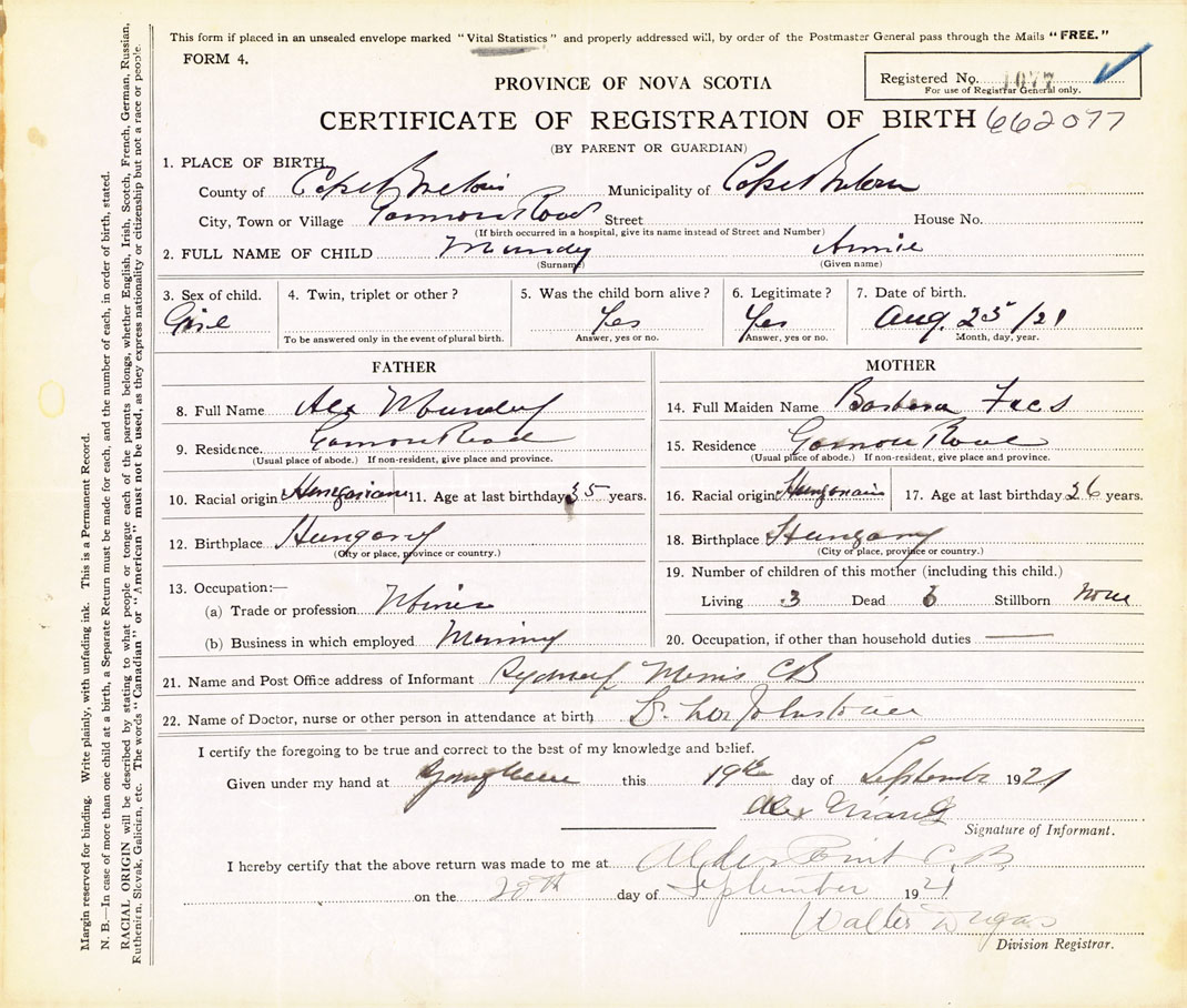 21. Name and Post Office address of Informant Sydney Mines, Cape Breton
