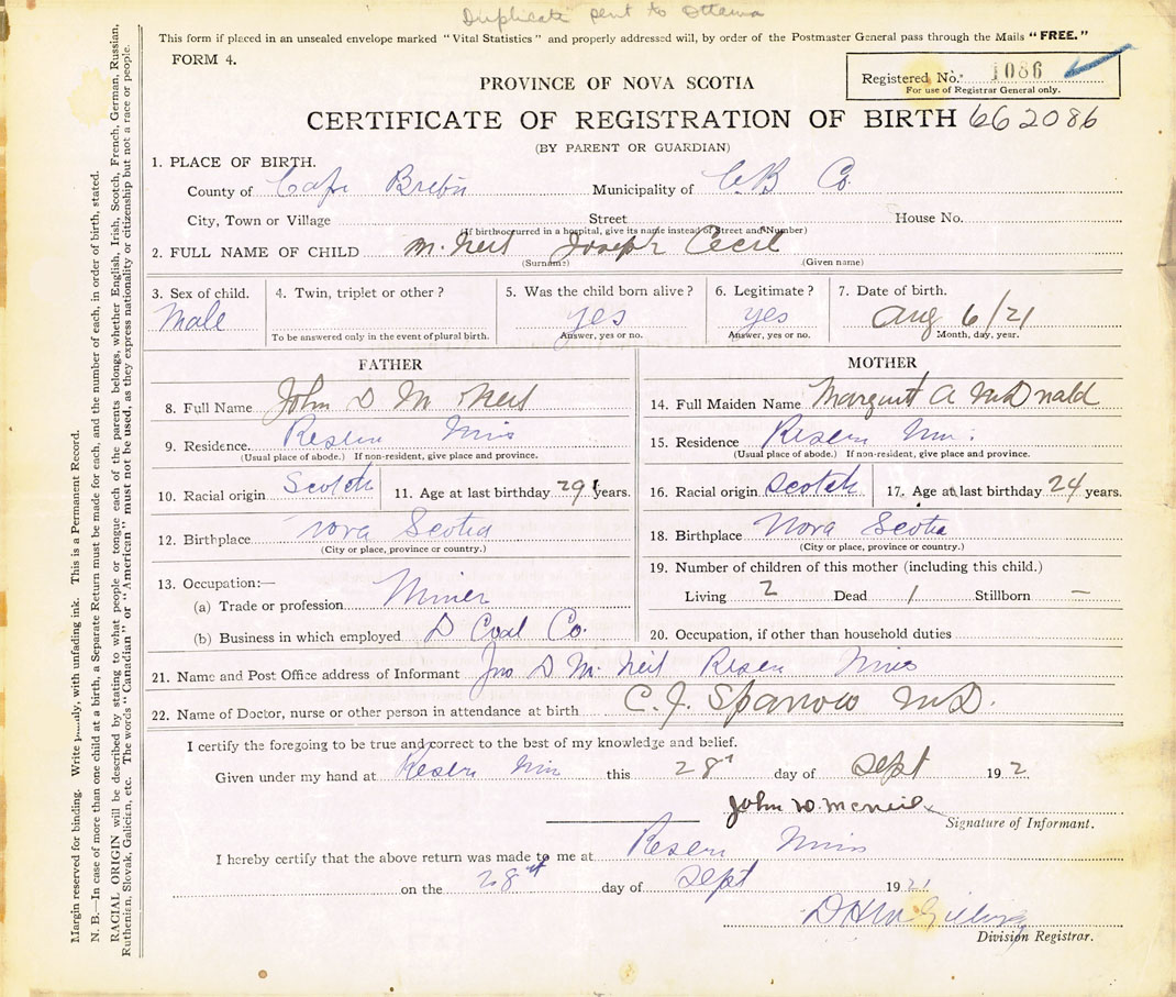 21. Name and Post Office address of Informant John D. McNeil Reserve Mines, Cape Breton Co., NS