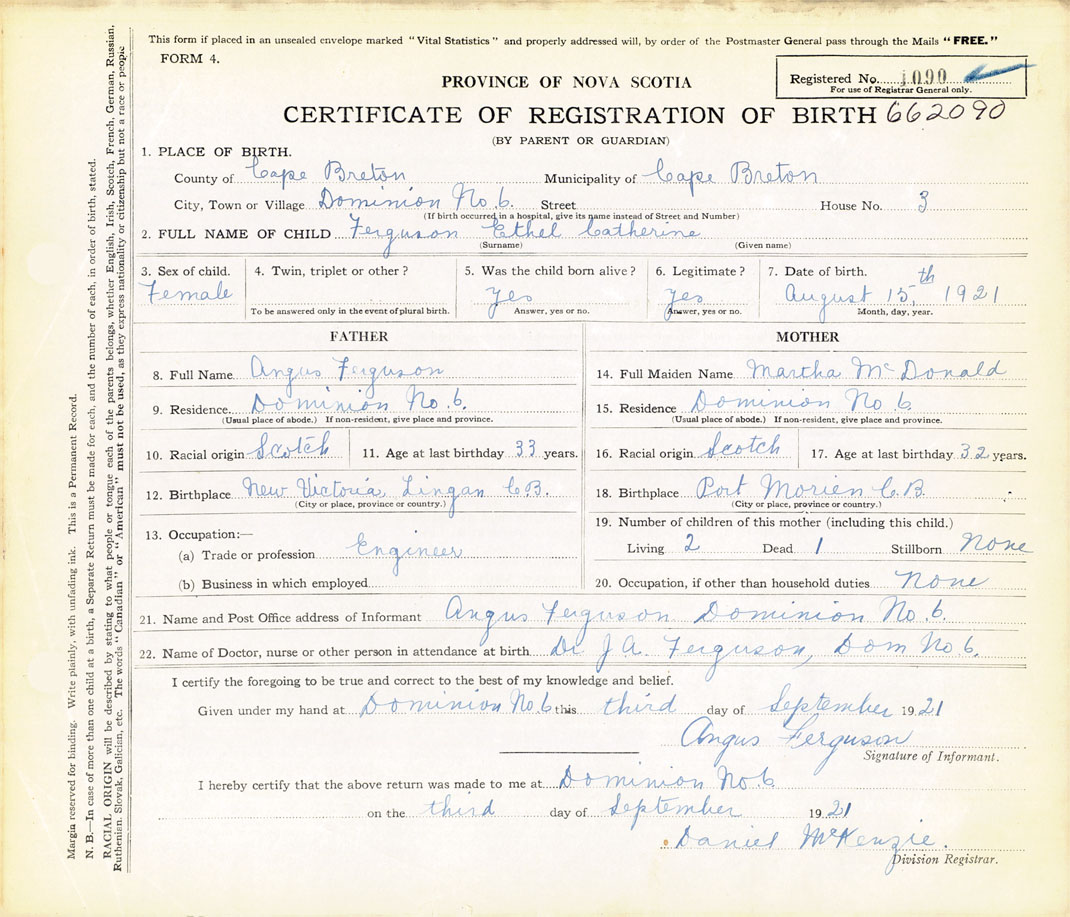 21. Name and Post Office address of Informant Angus Ferguson Dominion No. 6