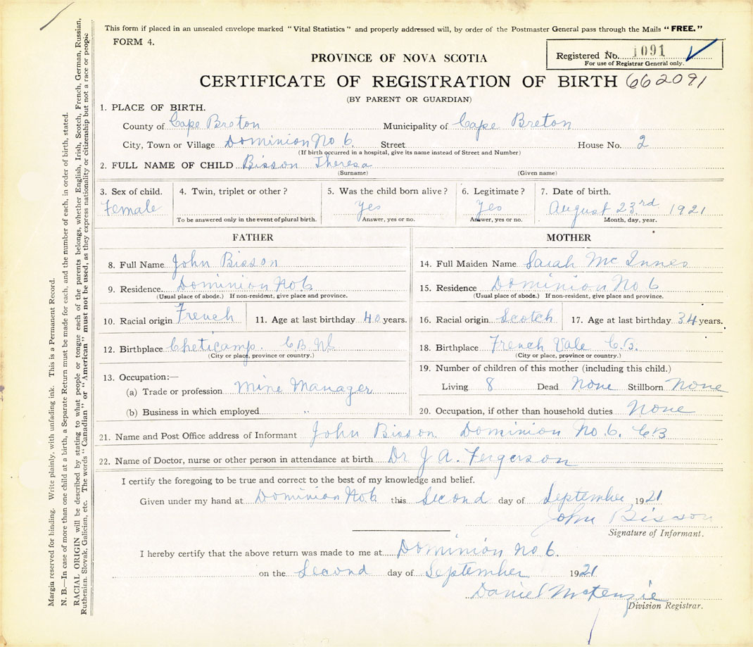 21. Name and Post Office address of Informant John Bisson Dominion No. 6 CB