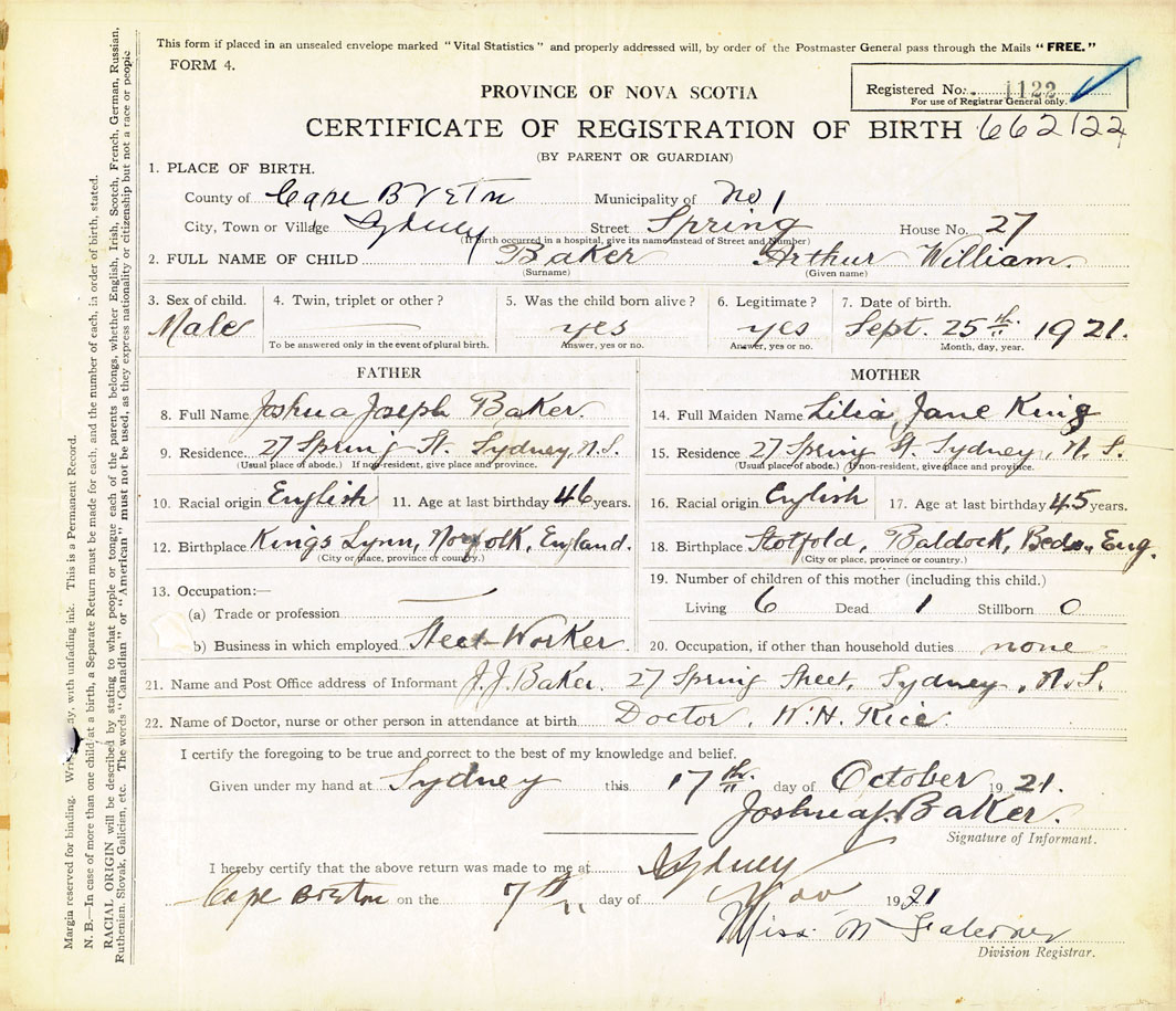 Male Birth Registration: Year: 1921 number: 66200122