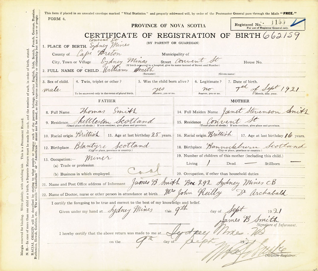 21. Name and Post Office address of Informant James B Smith Box 292 Sydney Mines, CB