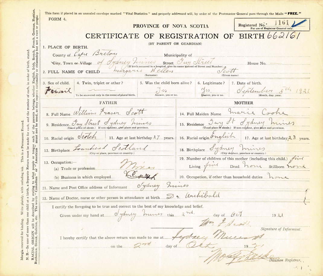 21. Name and Post Office address of Informant Wm F Scott Sydney Mines
