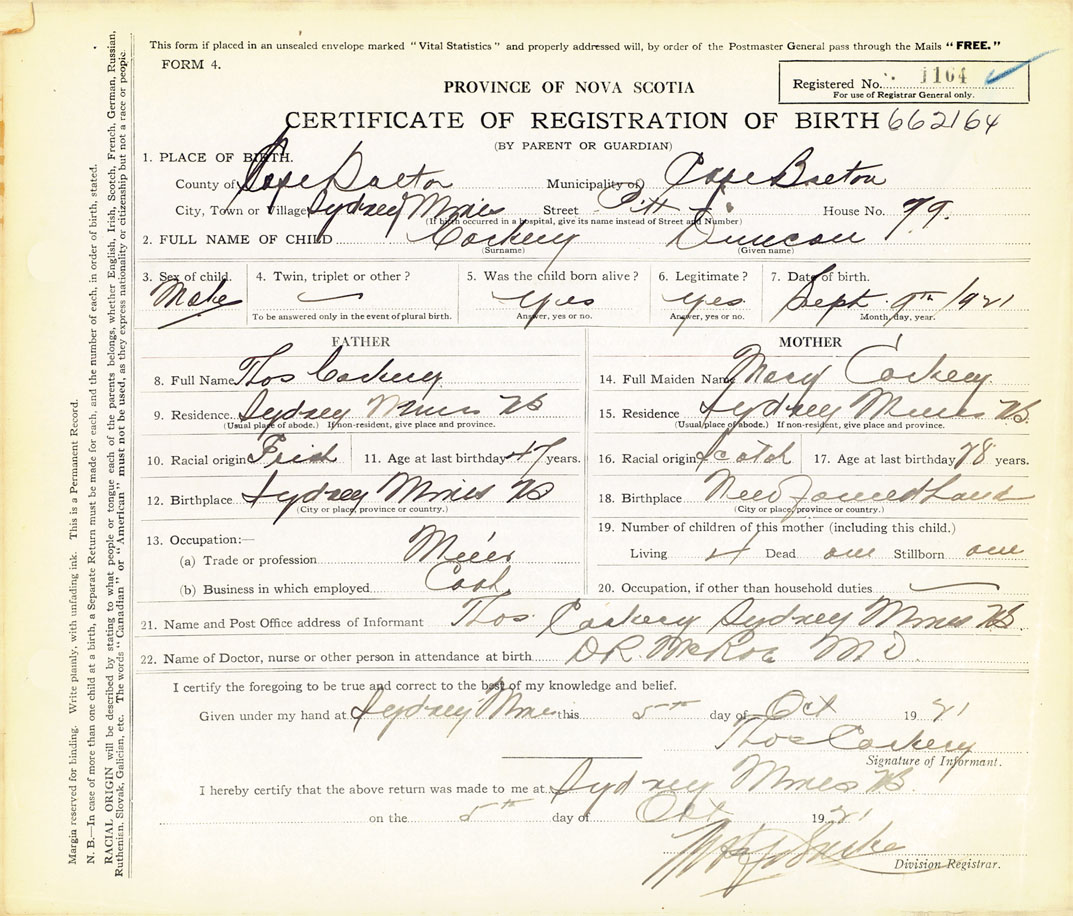 21. Name and Post Office address of Informant Thomas Cockery Sydney Mines, Cape Breton