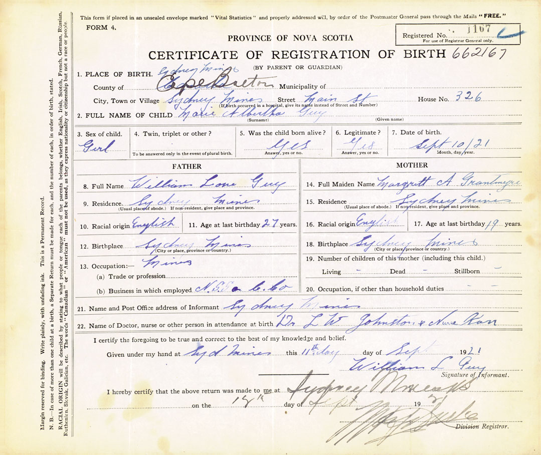 21. Name and Post Office address of Informant Sydney Mines, Cape Breton