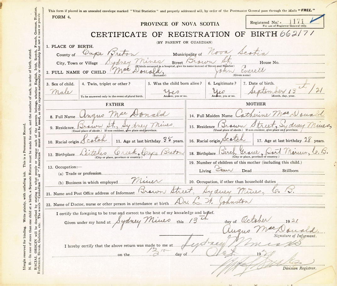 21. Name and Post Office address of Informant Angus MacDonald Brown Street, Sydney Mines, Cape Breton Co., NS