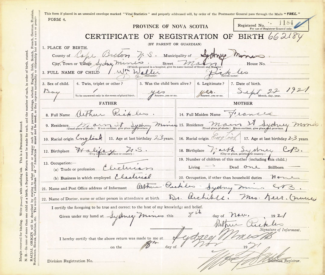 21. Name and Post Office address of Informant Arthur Pickles Sydney Mines, Cape Breton