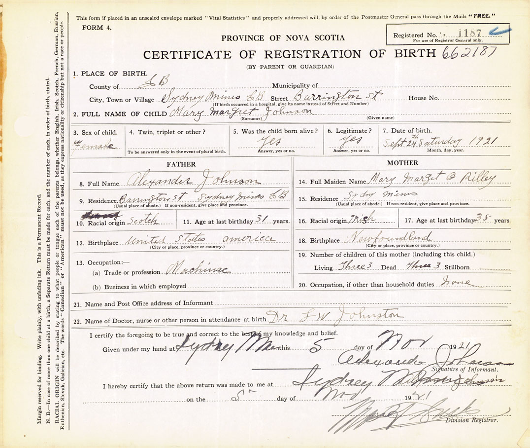 Female Birth Registration: Year: 1921 number: 66200187