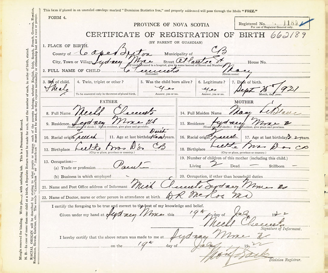 21. Name and Post Office address of Informant Mich Clements Sydney Mines, Cape Breton