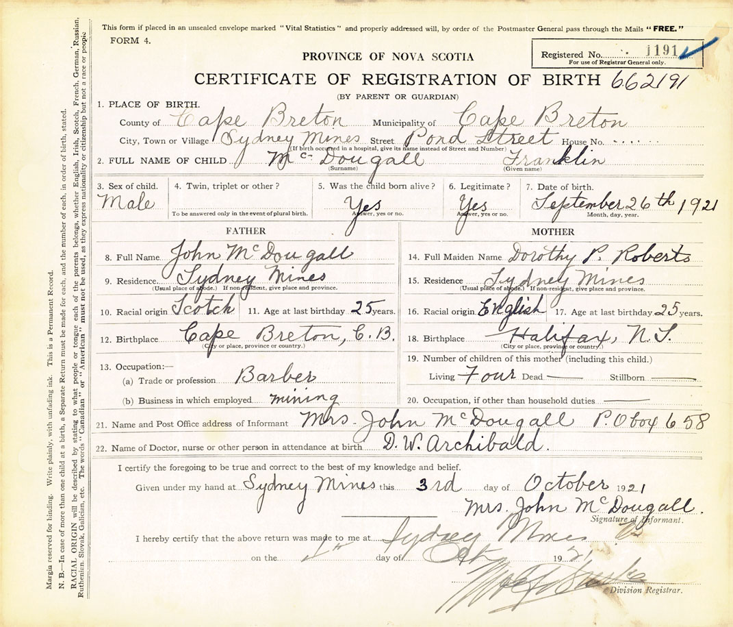 21. Name and Post Office address of Informant Mrs. John McDougall PO Box 658, Sydney Mines, Cape Breton
