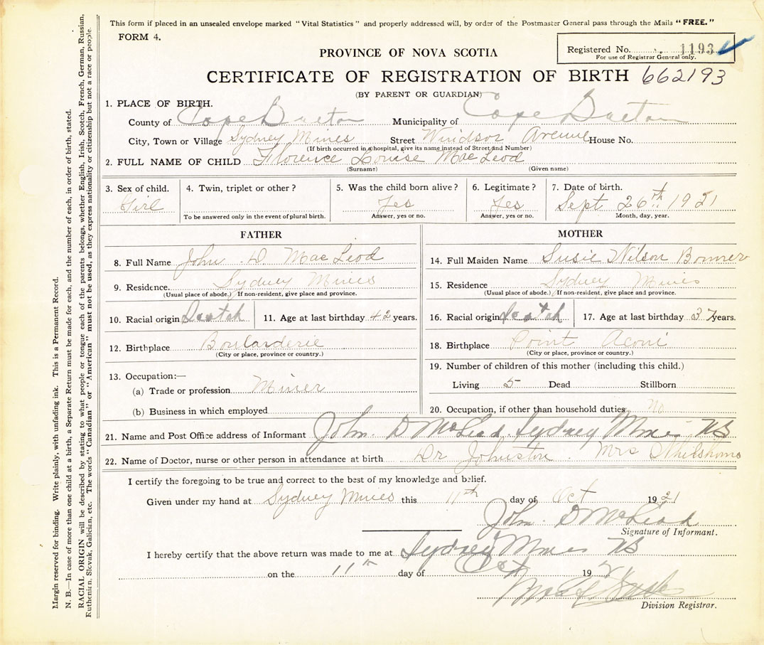 21. Name and Post Office address of Informant John D. MacLeod Sydney Mines, Cape Breton