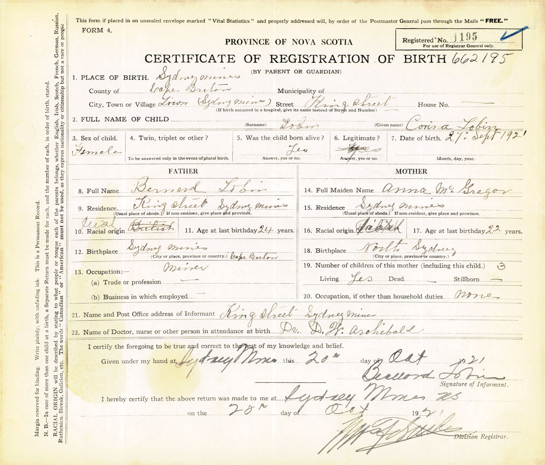 21. Name and Post Office address of Informant Bernard Tobin King Street, Sydney Mines, Cape Breton