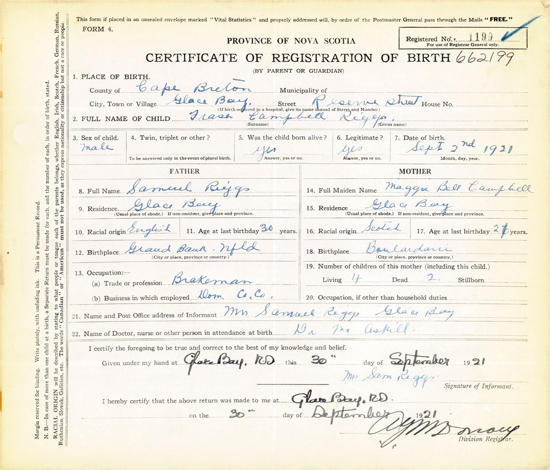 21. Name and Post Office address of Informant Mrs. Samuel Riggs Glace Bay