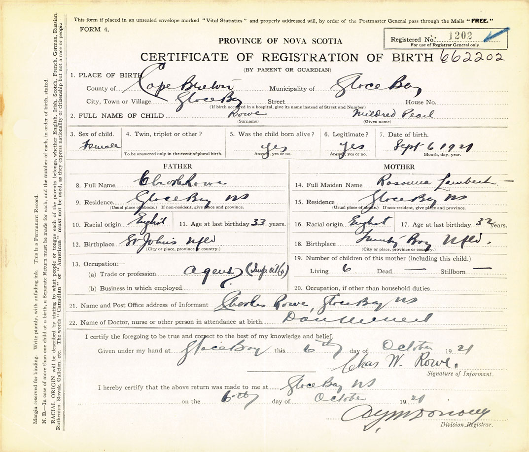 21. Name and Post Office address of Informant Charles Rowe Glace Bay, Cape Breton