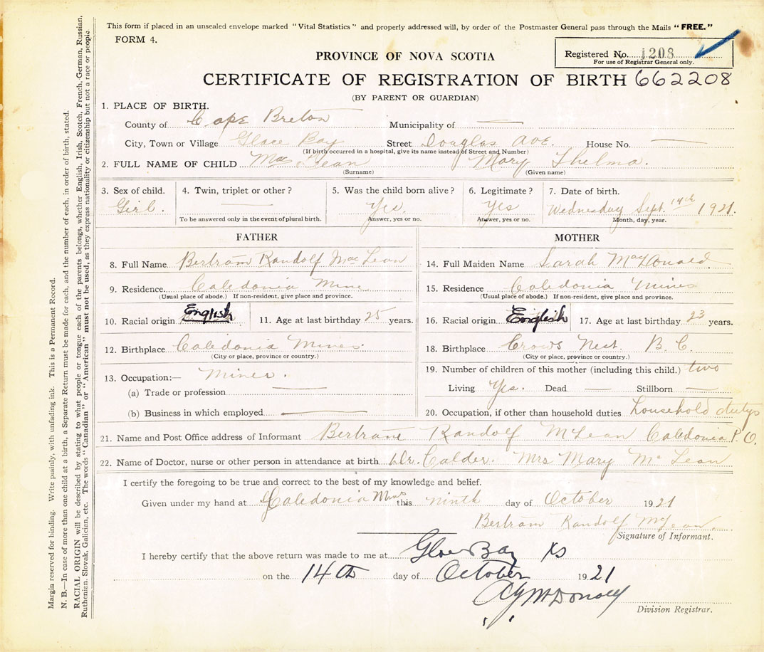 21. Name and Post Office address of Informant Bertram Randolf McLean Caledonia Post Office, Cape Breton