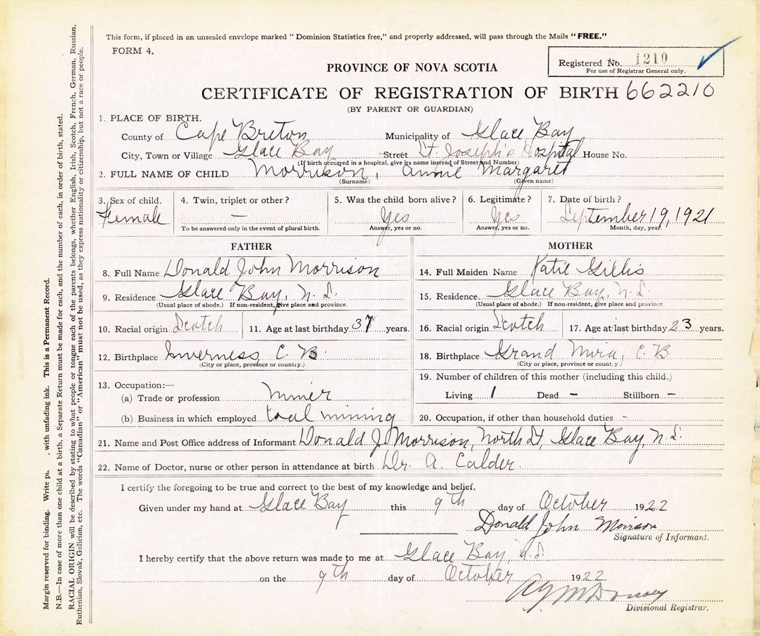 21. Name and Post Office address of Informant Donald J. Morrison North Street, Glace Bay, Cape Breton