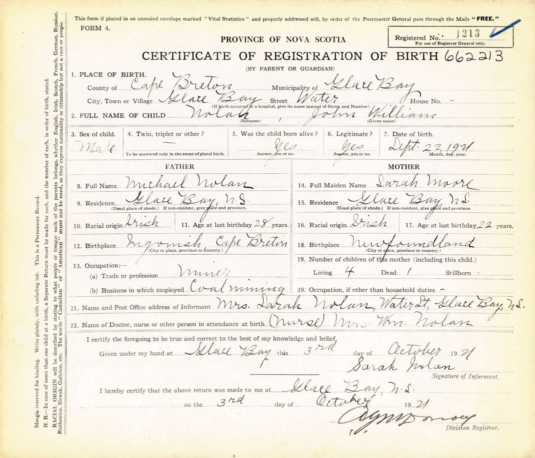 21. Name and Post Office address of Informant Mrs. Sarah Nolan Water Street, Glace Bay, Cape Breton