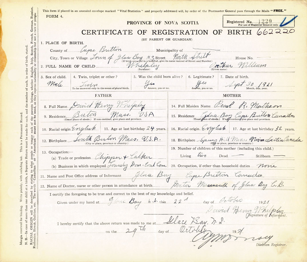 22. Name of Doctor, nurse or other person in attendance at birth Dr. Macaskill, Glace Bay, Cape Breton