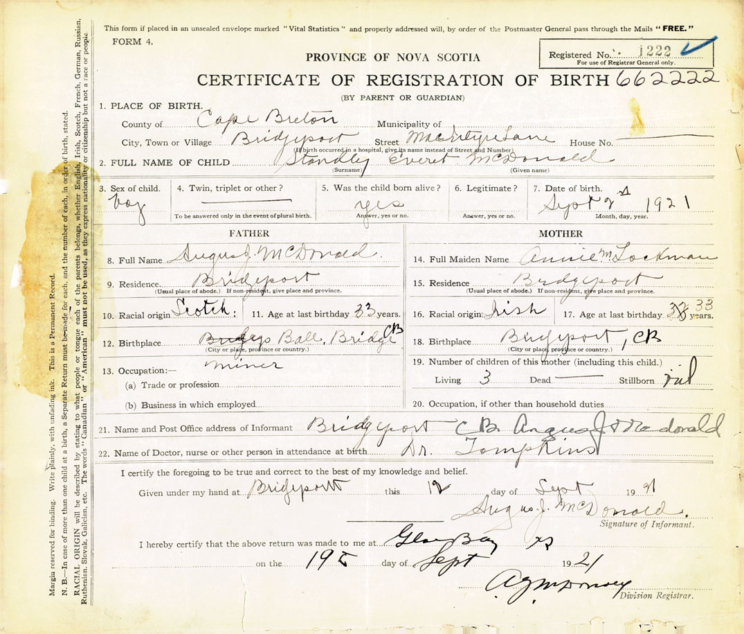 18. Birthplace Bridgeport, Cape Breton Co., NS