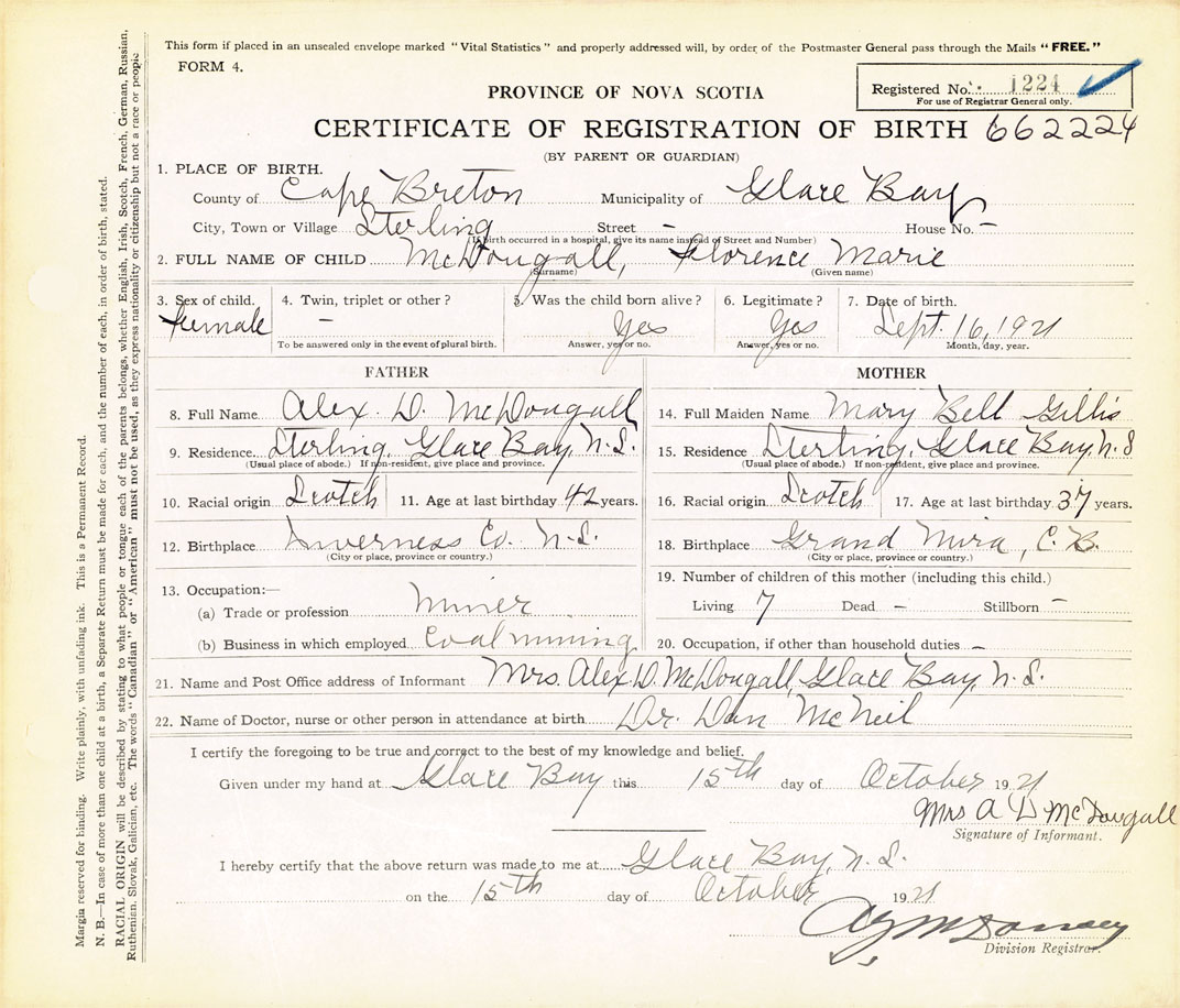 21. Name and Post Office address of Informant Mrs. Alex. D. McDougall Glace Bay, Cape Breton