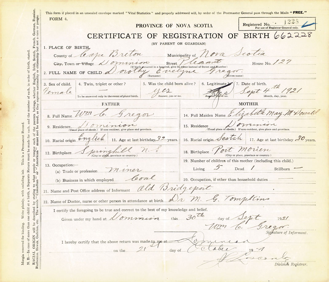 Female Birth Registration: Year: 1921 number: 66200228