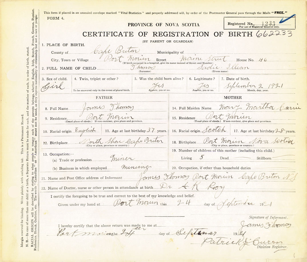 21. Name and Post Office address of Informant James Thomas Port Morien, Cape Breton