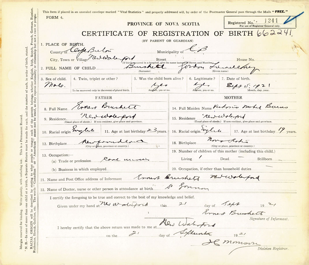 21. Name and Post Office address of Informant Ernest Brushett New Waterford, Cape Breton
