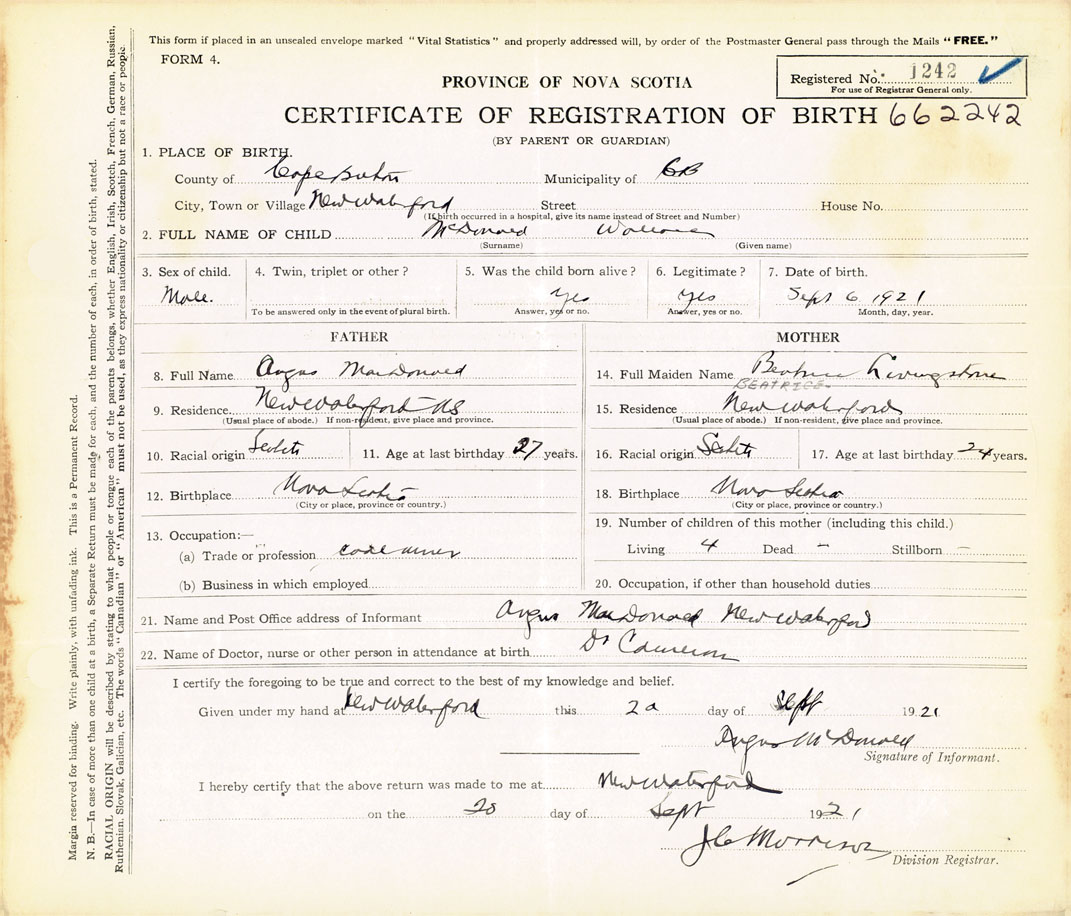 21. Name and Post Office address of Informant Angus MacDonald New Waterford, Cape Breton