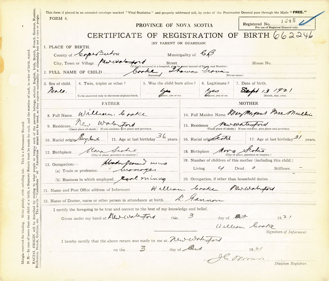 21. Name and Post Office address of Informant William Cooke New Waterford, Cape Breton