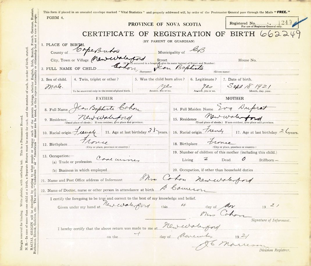 21. Name and Post Office address of Informant Mrs. Cohon New Waterford, Cape Breton