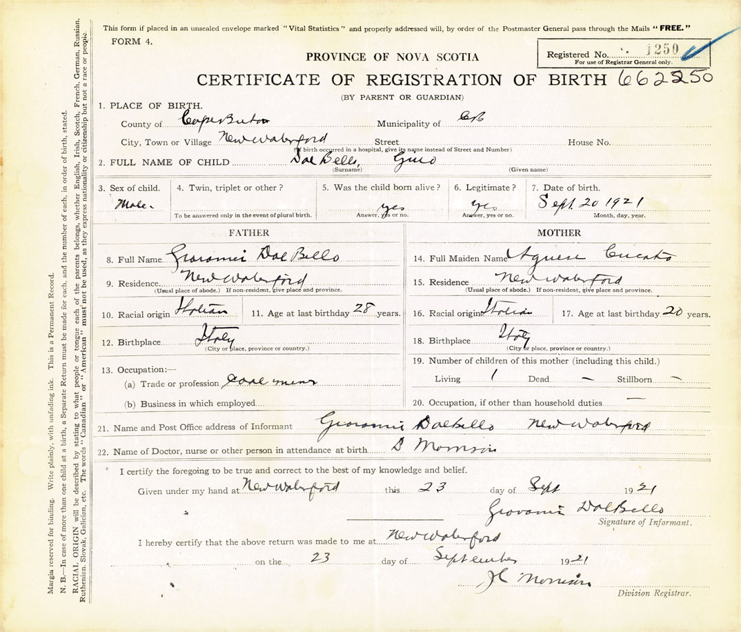 21. Name and Post Office address of Informant Giovanni DalBello New Waterford, Cape Breton
