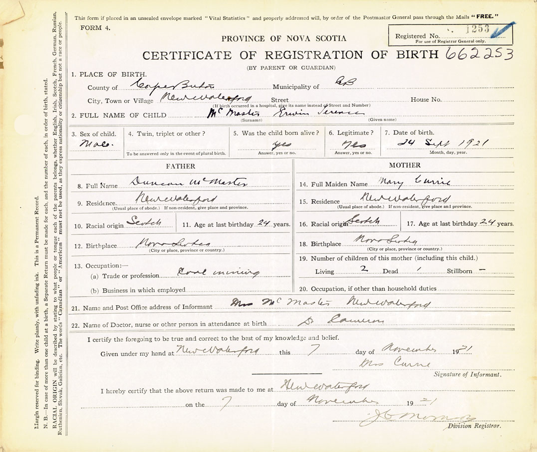 21. Name and Post Office address of Informant Mrs. McMaster New Waterford, Cape Breton
