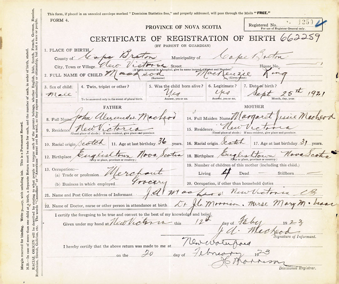 2. FULL NAME OF CHILD MacLeod, MacKenzie King