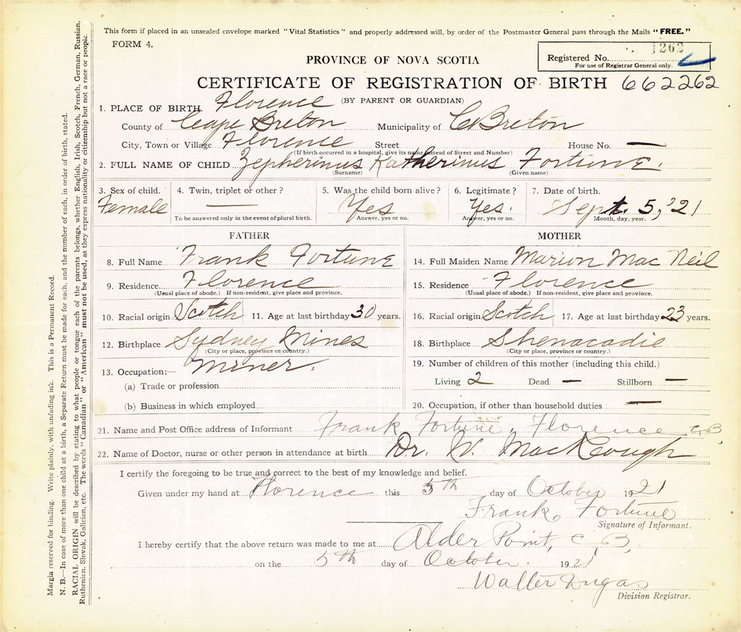 21. Name and Post Office address of Informant Frank Fortune Florence, Cape Breton