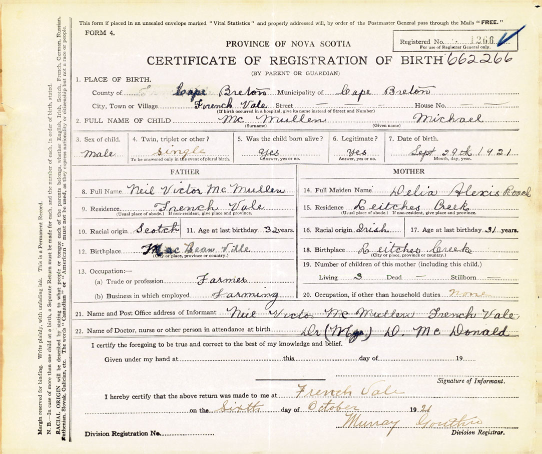 21. Name and Post Office address of Informant Neil Victor McMullen Frenchvale, Cape Breton