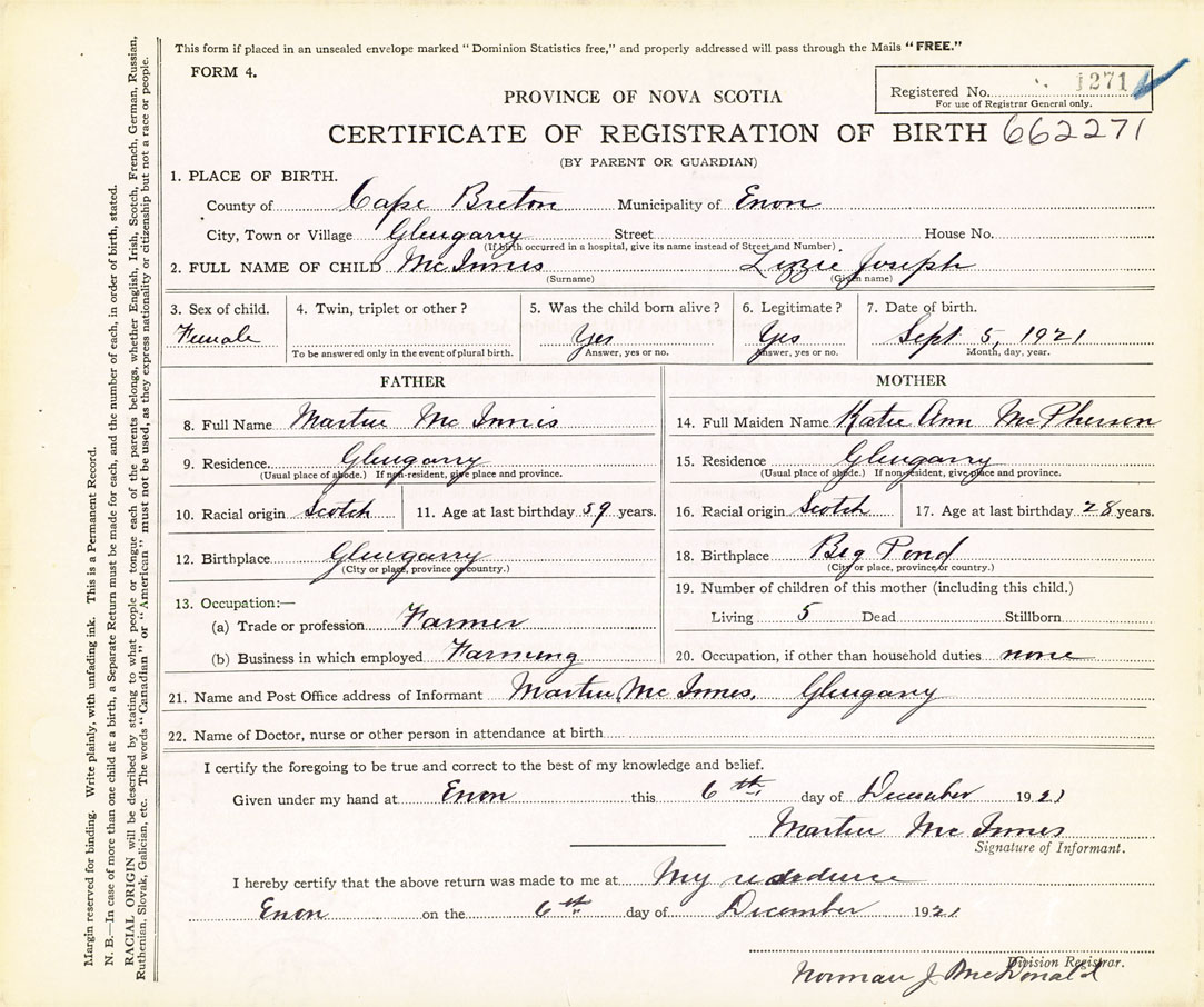 21. Name and Post Office address of Informant Martin McInnis Glengarry, Cape Breton