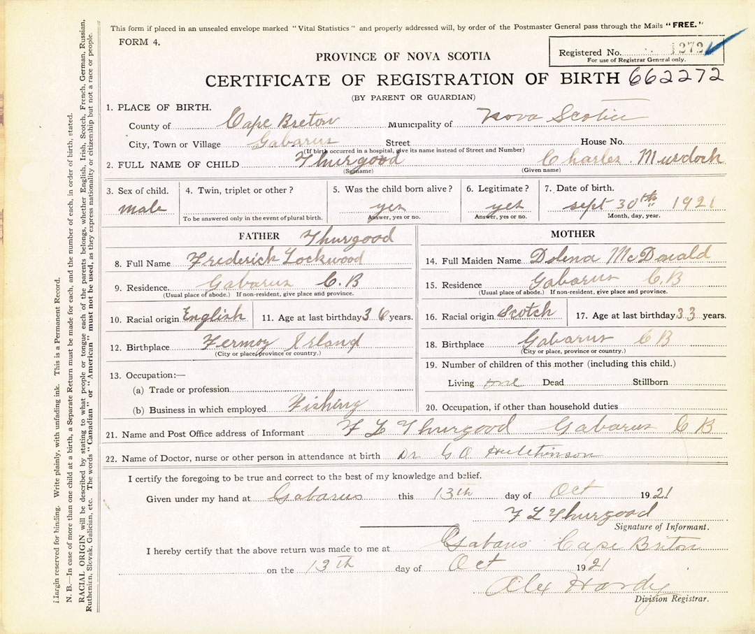21. Name and Post Office address of Informant F. L. Thurgood Gabarus, Cape Breton