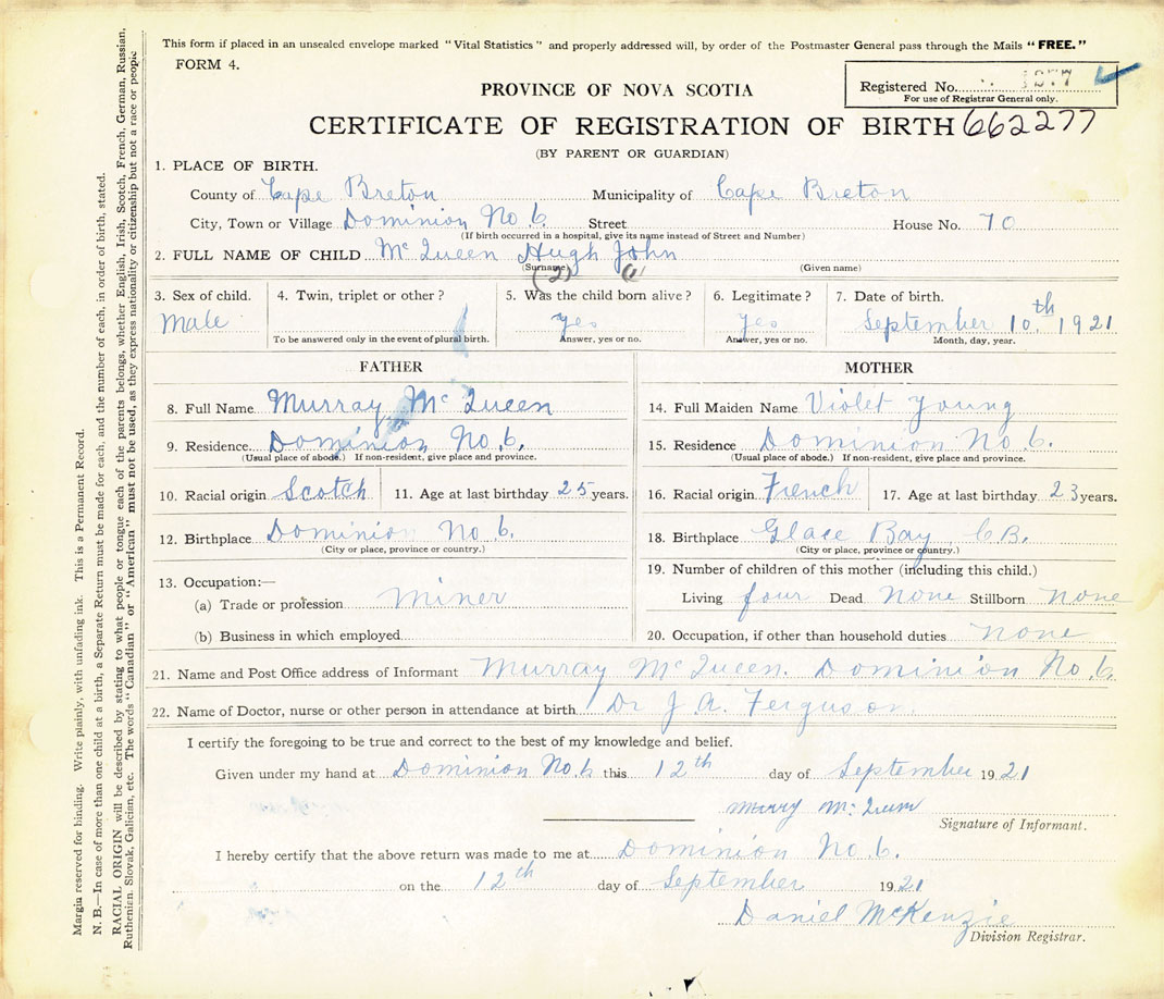 21. Name and Post Office address of Informant Murray McQueen Dominion No. 6, Cape Breton