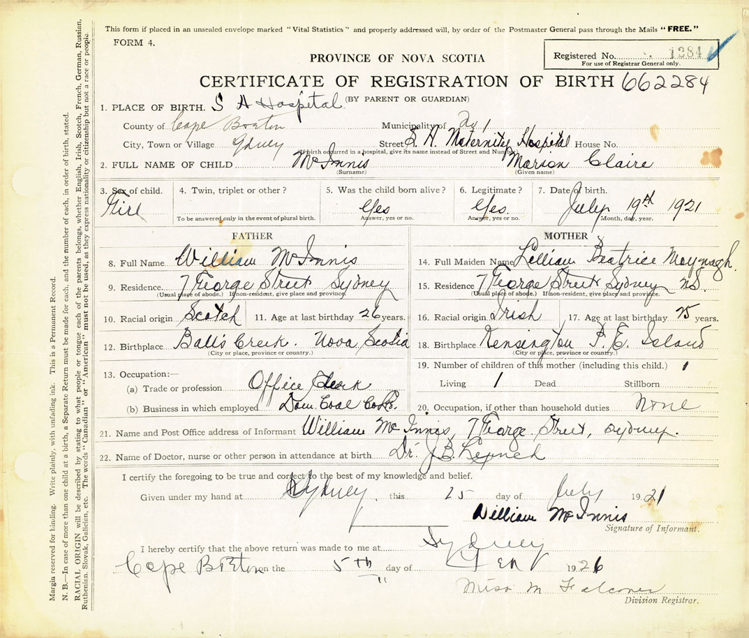 21. Name and Post Office address of Informant William McInnis 7 George Street, Sydney, Cape Breton