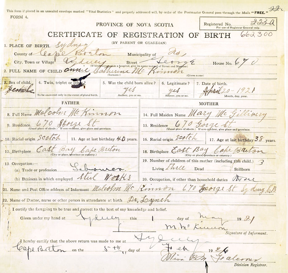 21. Name and Post Office address of Informant Malcolm McKinnon 670 George St., Sydney, Cape Breton