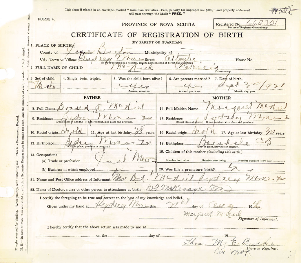 21. Name and Post Office address of Informant Mrs. D. A. McNeil Sydney Mines, Cape Breton