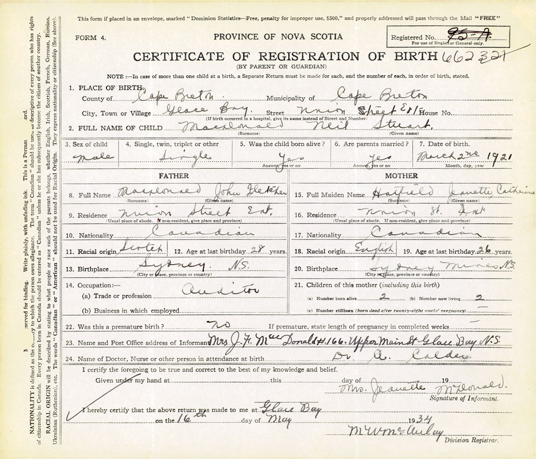 21. Name and Post Office address of Informant Mrs J.F. MacDonald 166 Upper Main Street, Glace Bay, NS