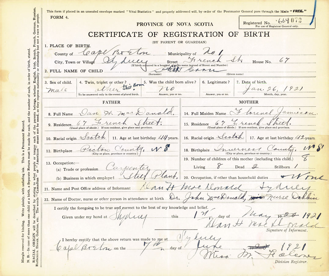 18. Birthplace Inverness County, N.S.
