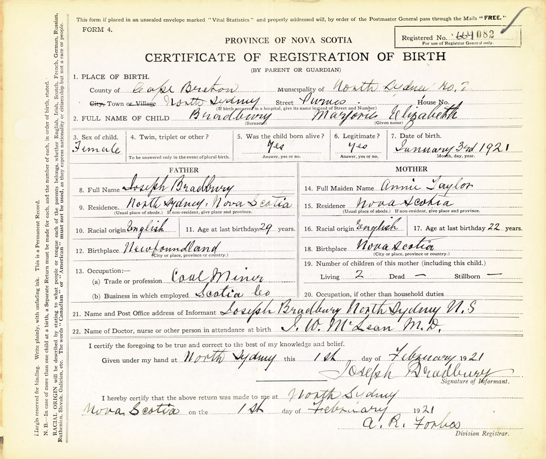 21. Name and Post Office address of Informant Joseph Bradbury North Sydney N.S.