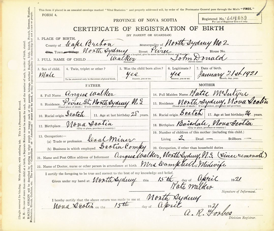 21. Name and Post Office address of Informant Angus Walke North Sydney N.S.