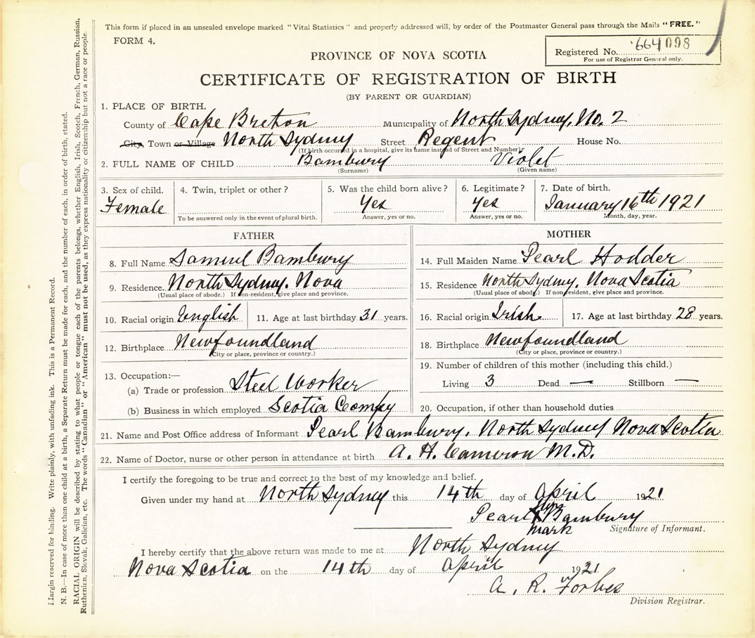 21. Name and Post Office address of Informant Pearl Bambury North Sydney, Cape Breton
