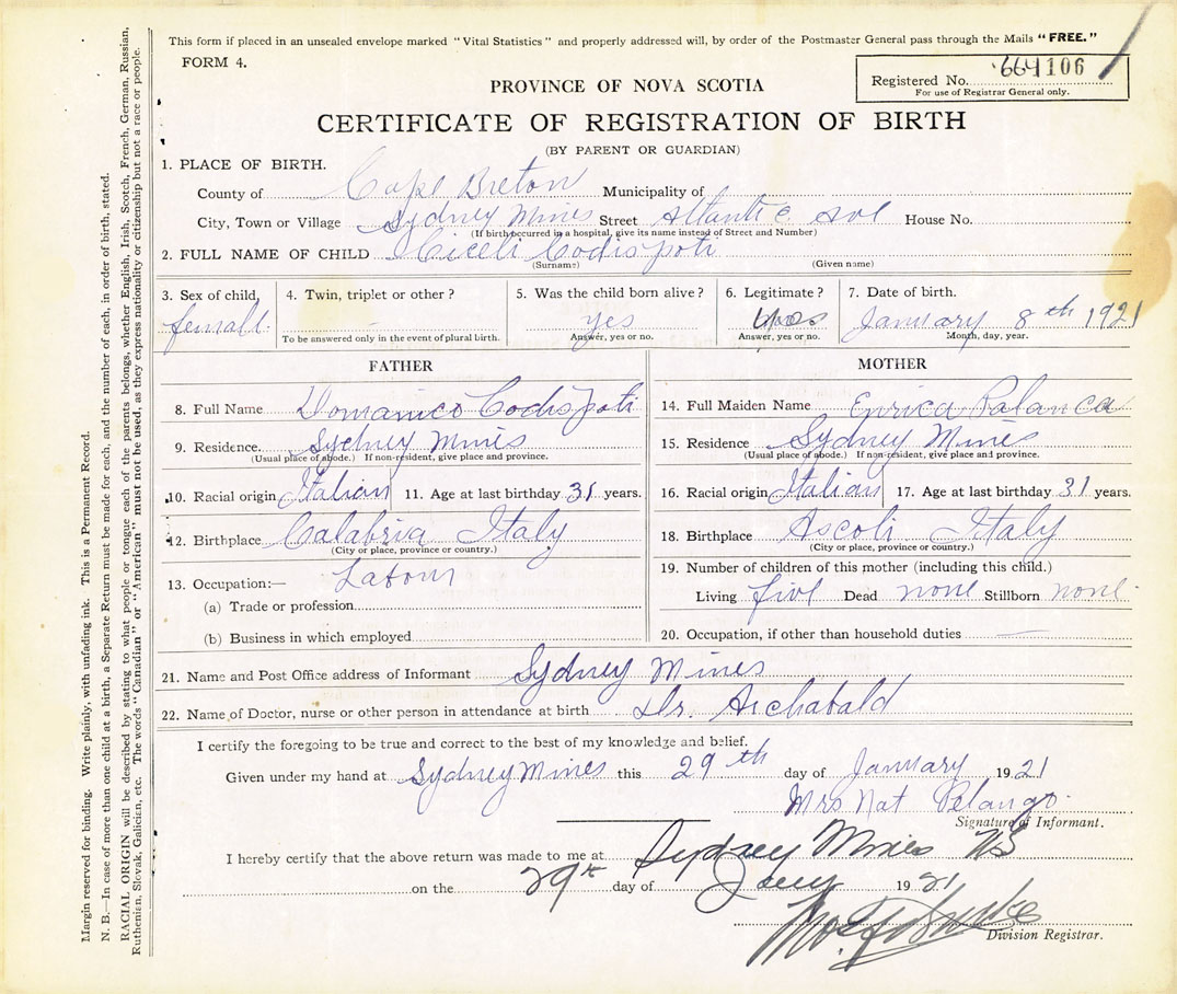 21. Name and Post Office address of Informant Sydney Mines, Cape Breton