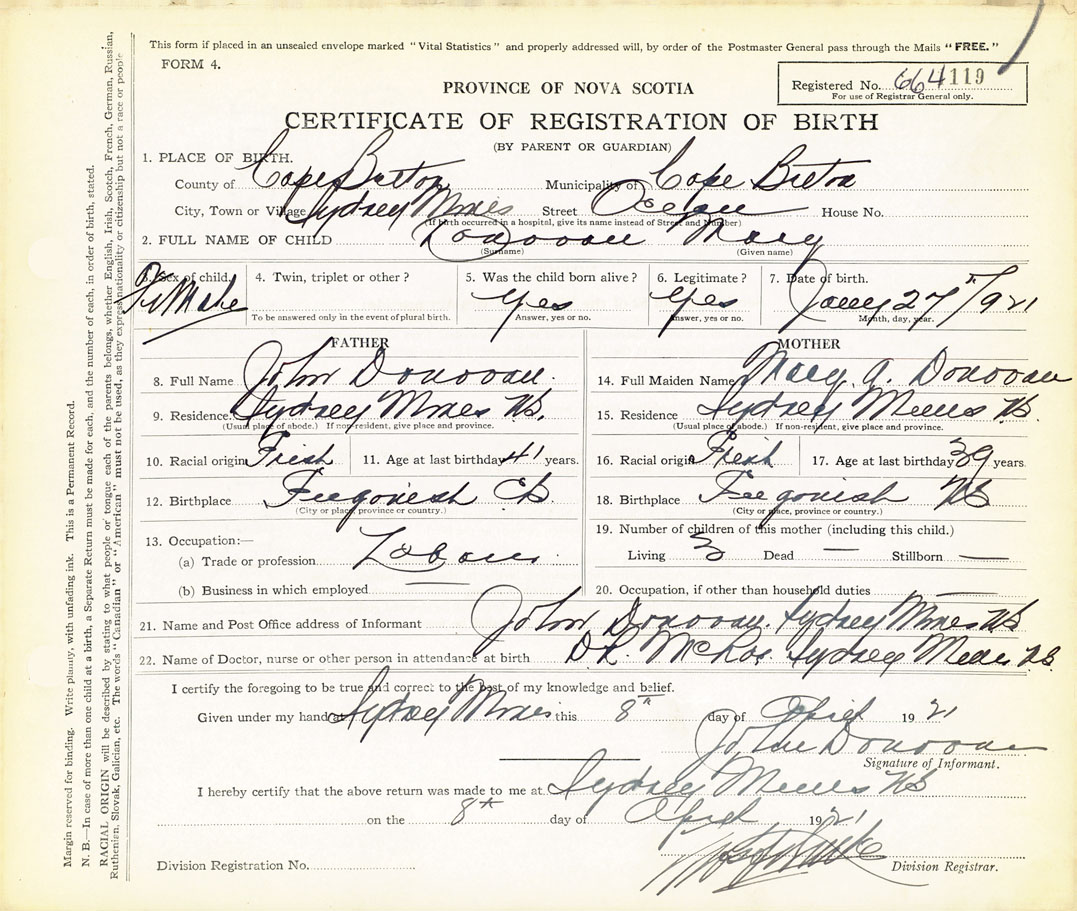21. Name and Post Office address of Informant John Donovan Sydney Mines, Cape Breton